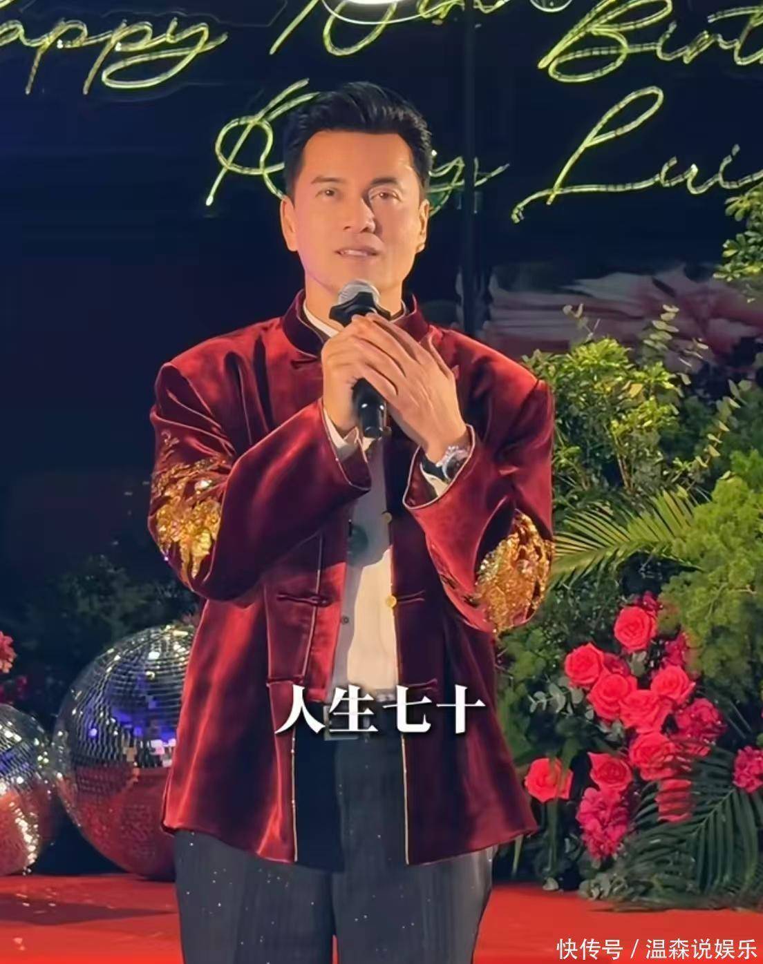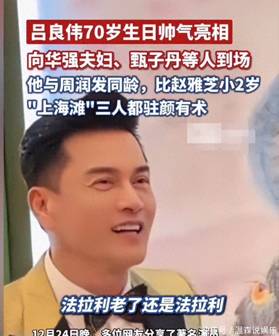 在生日会现场,吕良伟身穿暗红色丝绒外套,头发茂密且乌黑,梳得非常整齐。虽然70岁了,但是皮肤光滑、声音洪亮、身形修长,没有明显的衰老和身材走样迹象。