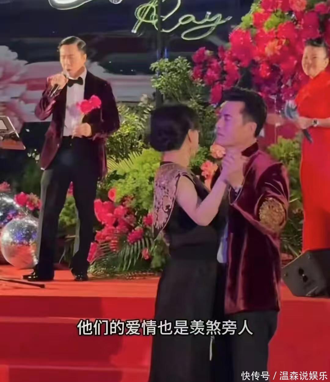 甄子丹带着妻子汪诗诗也来了。汪诗诗前段时间因为火灾甩锅内地的言论风波,在熟人圈恐怕也是丢尽了脸,所以这次她显得拘谨低调,刻意与丈夫分开站位。作为吕良伟的好友,甄子丹竟然坐在寿星身边,可见关系不一般。甄子丹还现场上台为吕良伟高歌一曲,吕良伟则在台下和老婆甜蜜地跳舞。